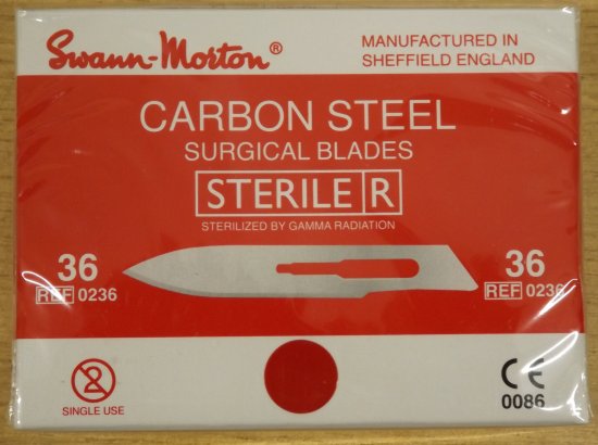 Swann Morton No36 Sterile Carbon Steel Surgical Blades. Box of 100 Packets single peel VPI protected. BS 2982