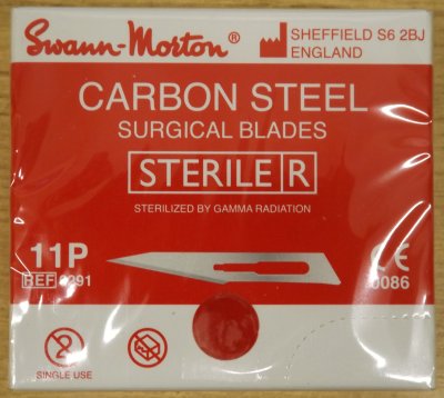 Swann Morton No 11P Non Sterile Blades, Individually VPI protected in Metal Foil Packs of 5 Blades. Available in Grip-Seal a bag of 10, 25 and 50 Blades or Boxes of 100 Blades ( note the grip-seal bags of 10, 25 or 50 are packed by Scalpels and Blades ). Also available in boxes of 100 Blades packed in single foil packs ref 3091